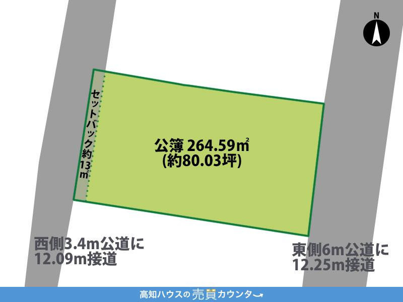 二方(除角地) 西 間口12m 公道 幅3.4m 東 間口12.2m 公道 幅6m |