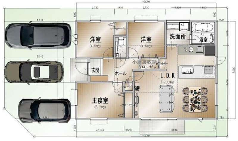 | 設備 | 電気、上水道、浄化槽、システムキッチン、カウンターキッチン、食器洗浄乾燥機、IHクッキングヒーター、追焚機能、温水洗浄便座、シャンプードレッサー、浴室乾燥機、照明器具付き、複層ガラス、インターネット、オール電化、床下収納、駐車3台以上可、ディンプルキー、モニタ付インターホン、火災警報器等設置済 | ||