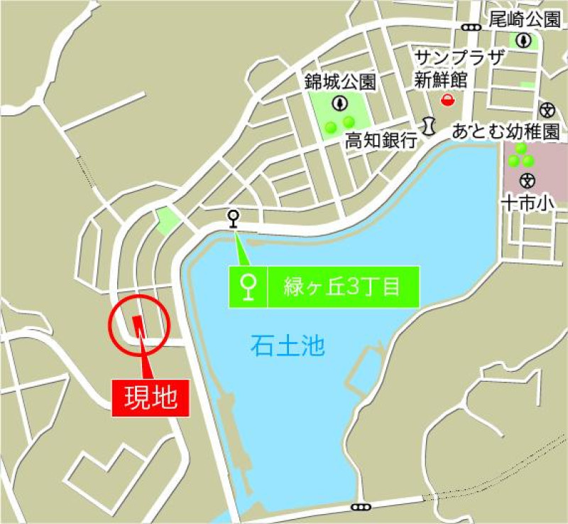 ※地図上の「対象地」は「高知県南国市緑ケ丘3丁目 」付近を示しています。実際の場所ではない場合がございます。詳しくはお問い合わせください。